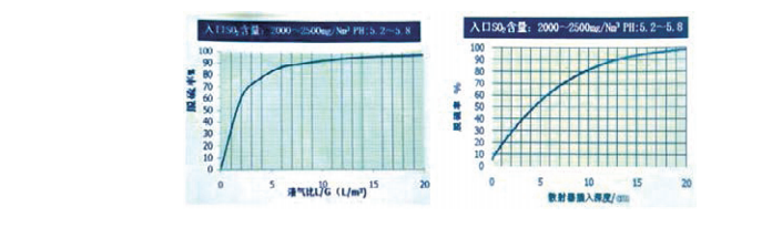 高压反冲洗净化塔是喷射塔和鼓泡塔的改进型,新型结构的脱硫、除尘塔。其脱硫过程可分为两次。第一次是利用喷射塔脱硫曲线的斜率最大段(见图),即:脱硫效率最高处(液气比为1~2处)进行烟气脱硫,同时对进入高压反冲洗蠕动净化塔的烟气还有降温、增湿和对高压反冲洗旋流净化塔的内腔进行清洗的作用。第二次是利用高压反冲洗旋流进行脱硫,由于烟气脱硫时具有分散相(烟气中的SO2)对连续相(吸收液)的优点,使得高压反冲洗旋流净化塔具有更节能的特点和更高的脱硫率。