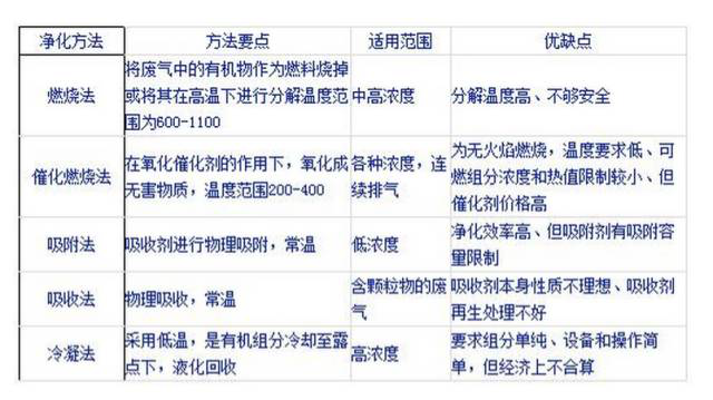 炭氢化合物(HC)是污染大气的重要污染物之一,其中包括简单的有机化合物。目前对于气态有机物污染物种类繁多,采用的治理的方法也有多种,常用的有:吸收法、吸附法、催化燃烧法、燃烧法、冷凝法等。这些方法应用中各有特点和利弊,需要根据污染程度、使用环境与条件来权衡。对于环保检查机构和污染治理方所共同关心的是:初次投资费、运行费用、二次污染、处理效果、维护等方面的问题。简而言之这些方法均能满足一定条件下气态污染物的处理。对于以上各种方法的适用范围以及特点叙述入如下图