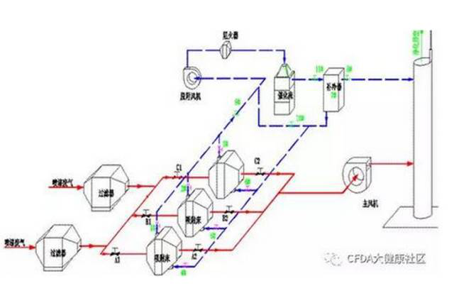 2、第二阶段开始时是用附加的加热器加热一股气流,利用热气流去加热吸附饱和的活性炭,将被吸附的有机成分激活气化而从活性炭中脱附逸出。恢复活性的活性炭即可以重新吸附有机成分的气体分子;
